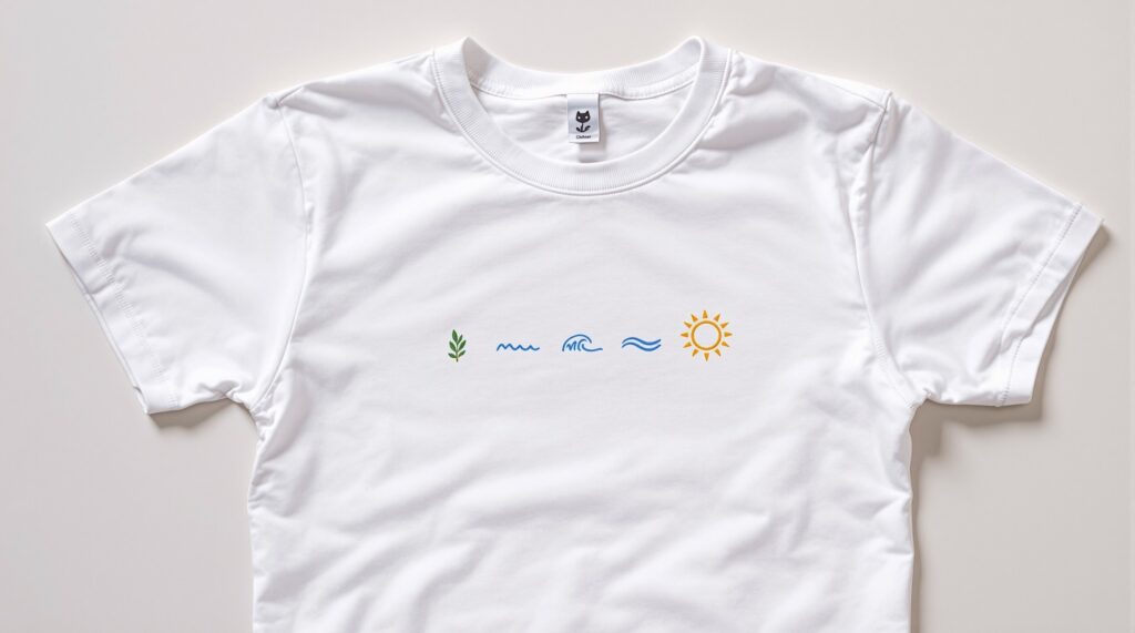 • et puis, tout est affaire de place : chaque recoin du t-shirt raconte une histoire différente selon l’emplacement du motif et le choix des symboles. Un nuage caché derrière la nuque, un croquis sur la manche… Ni tout à fait le minimalisme, ni vraiment le grand poème, juste un chapitre textile rédigé à sa façon, demain peut-être ailleurs.